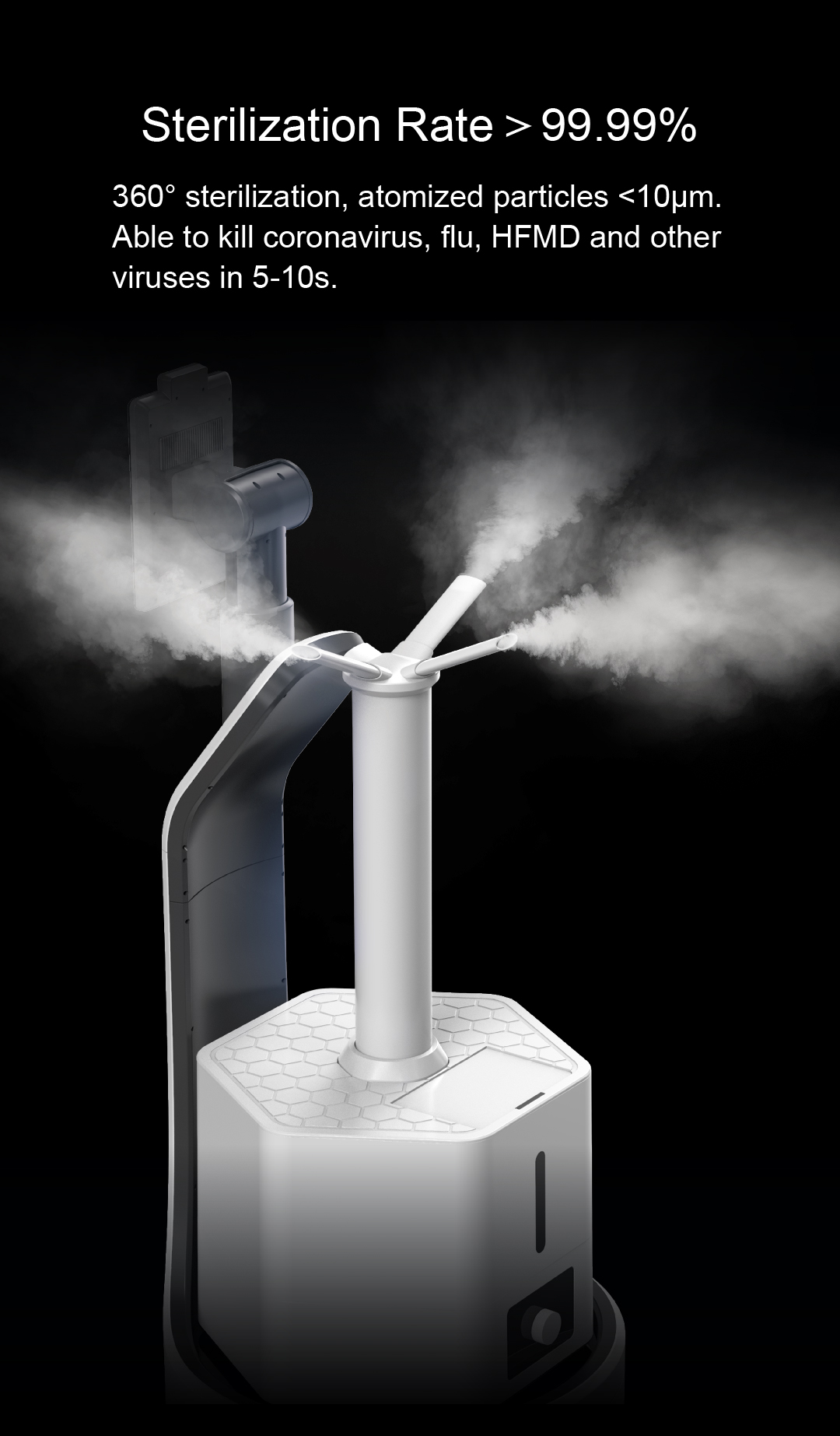 360° sterilization, atomized particles <10μm; able to kill coronavirus, flu, HFMD and other viruses in 5-10s.